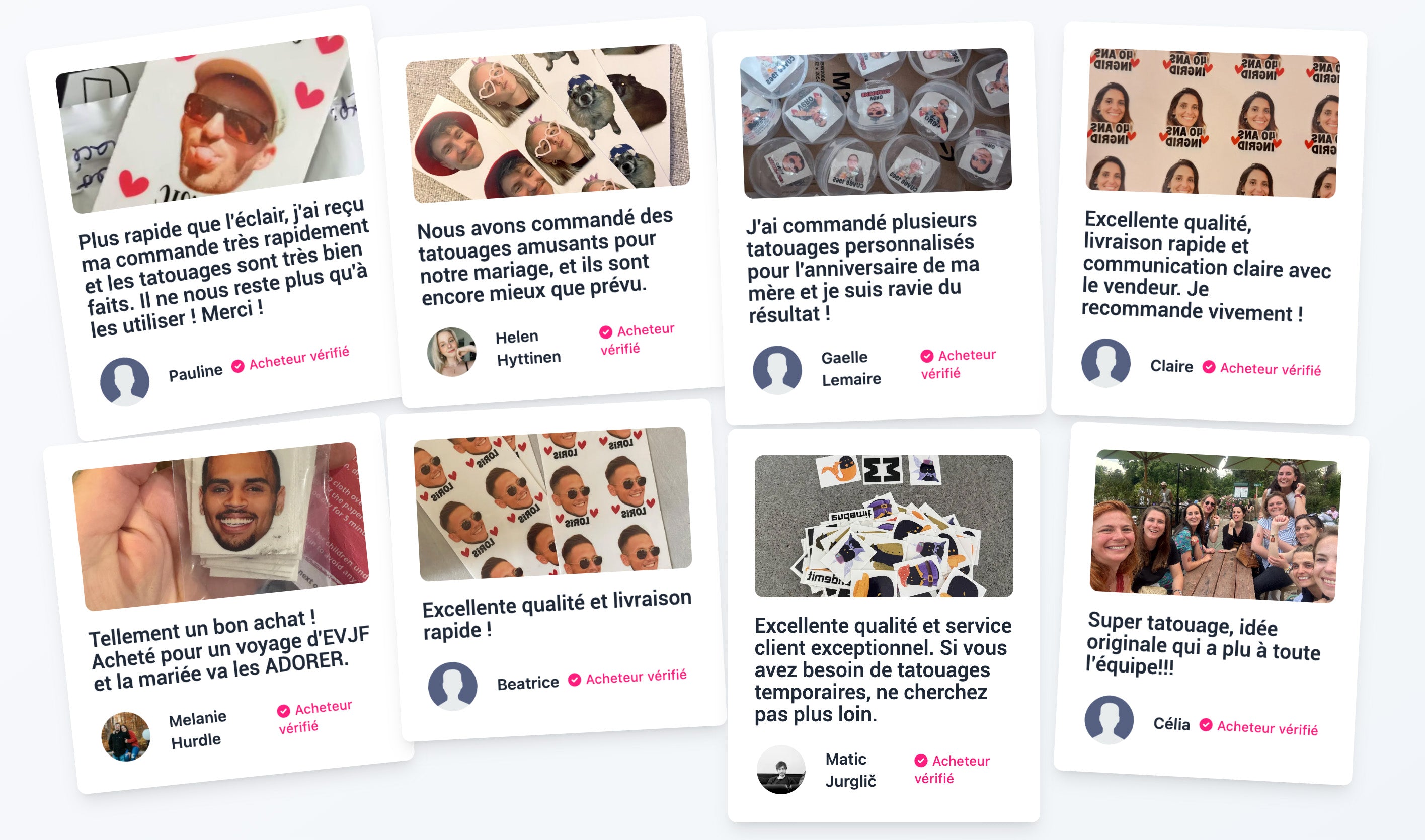 Que ce soit un souvenir précieux, une passion ou une envie d’exprimer votre style, nous créons des tatouages de toutes formes pour refléter ce qui vous tient à cœur. Nos créations, réalisées avec soin et passion, nous valent une incroyable note moyenne de 4,9/5 sur nos 50 derniers avis clients. Parce que votre satisfaction est notre plus belle récompense ! ✨